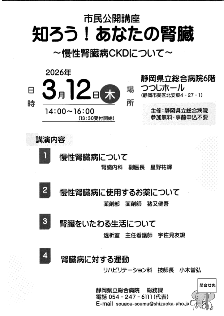 静岡県立総合病院では、2026年3月12日(木)に慢性腎臓病(CKD)をテーマにした市民公開講座を開催いたします 。